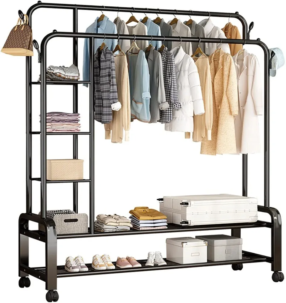 Portant à vêtements robuste sur roulettes, porte-manteau en métal avec 6 étagères de rangement et double tringle à vêtements, rangement portable pour vêtements et chaussures de rangement/B/150 * 50 *