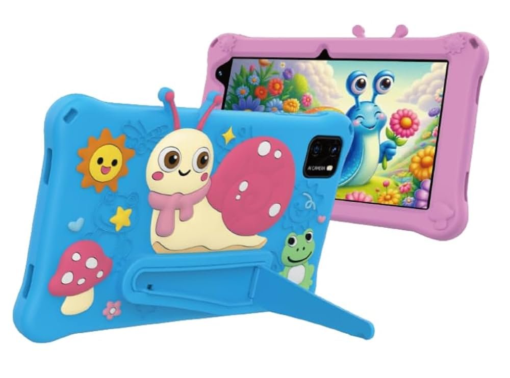 - C’est une tablette Android de 7 pouces conçue pour les enfants, avec une coque de protection antichoc sur le thème des dessins animés.