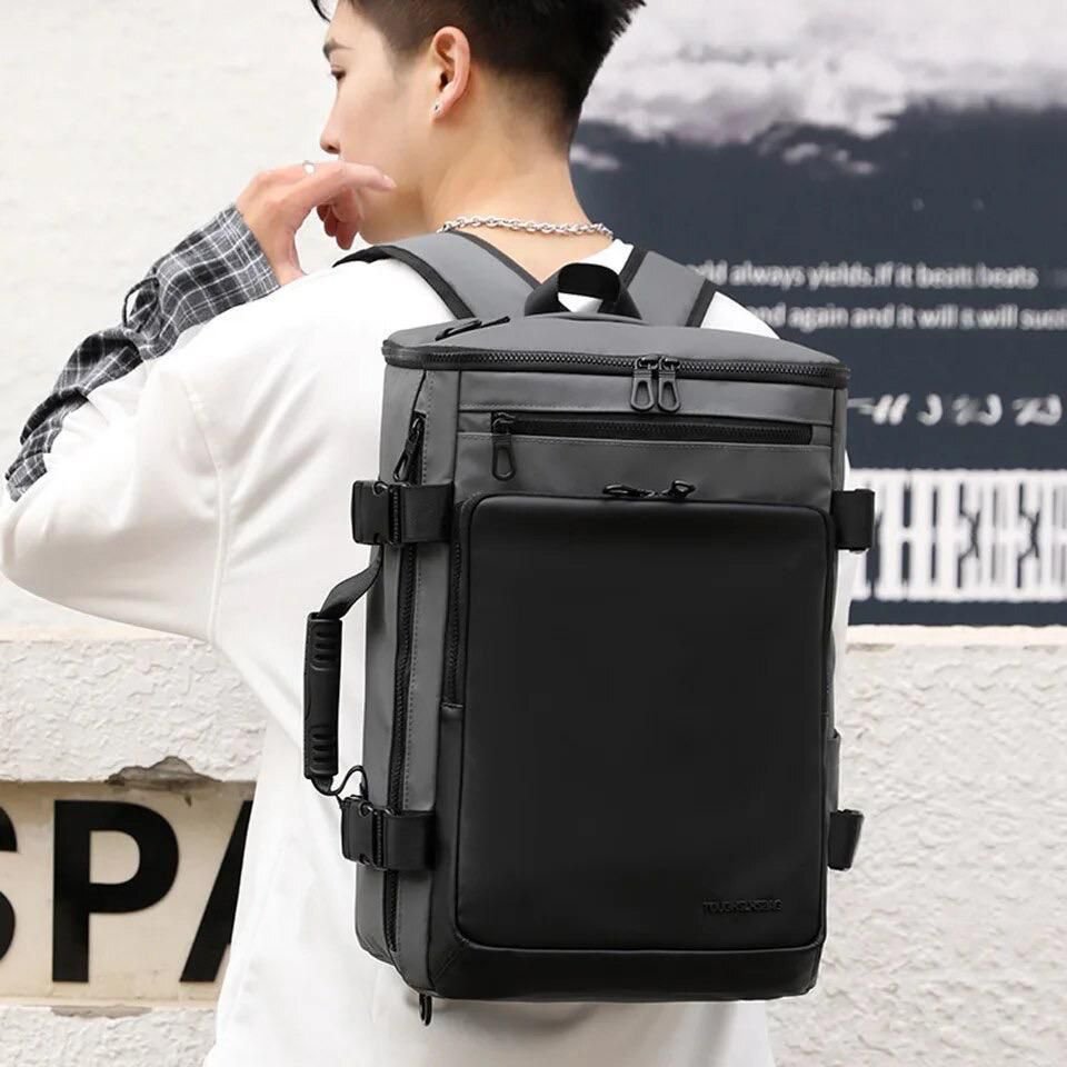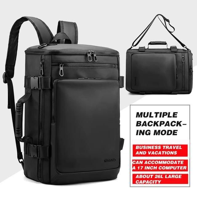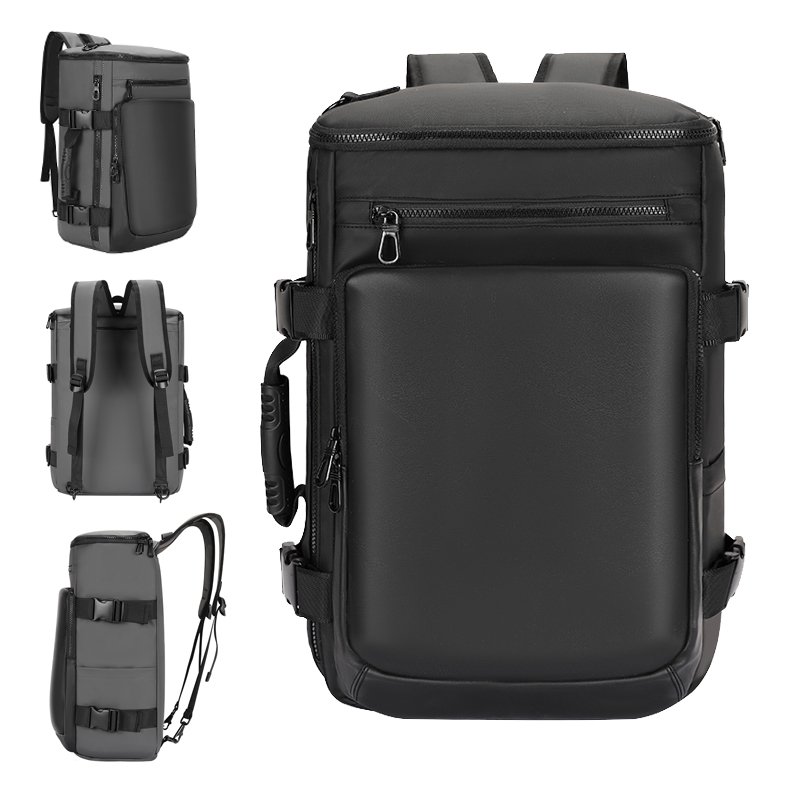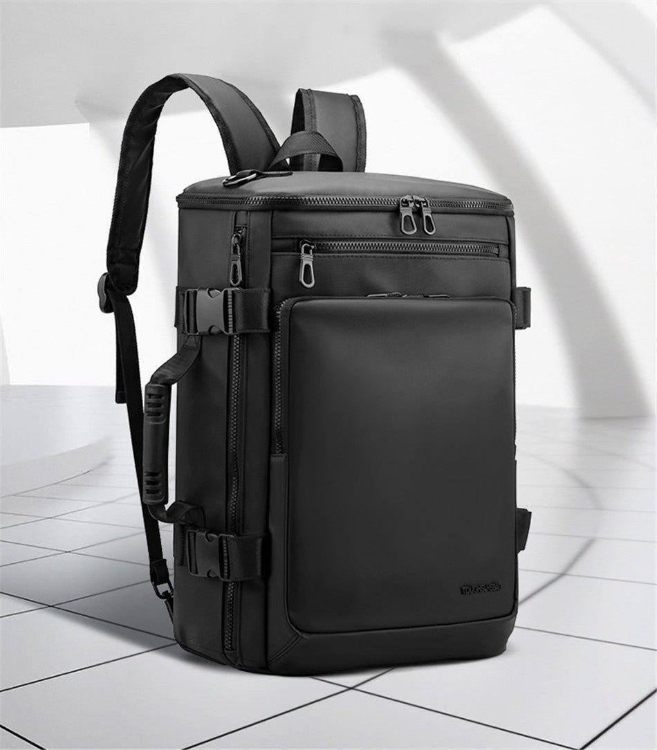 Un grand sac à dos noir multifonctionnel pour homme, adapté aux voyages d’affaires et aux vacances.